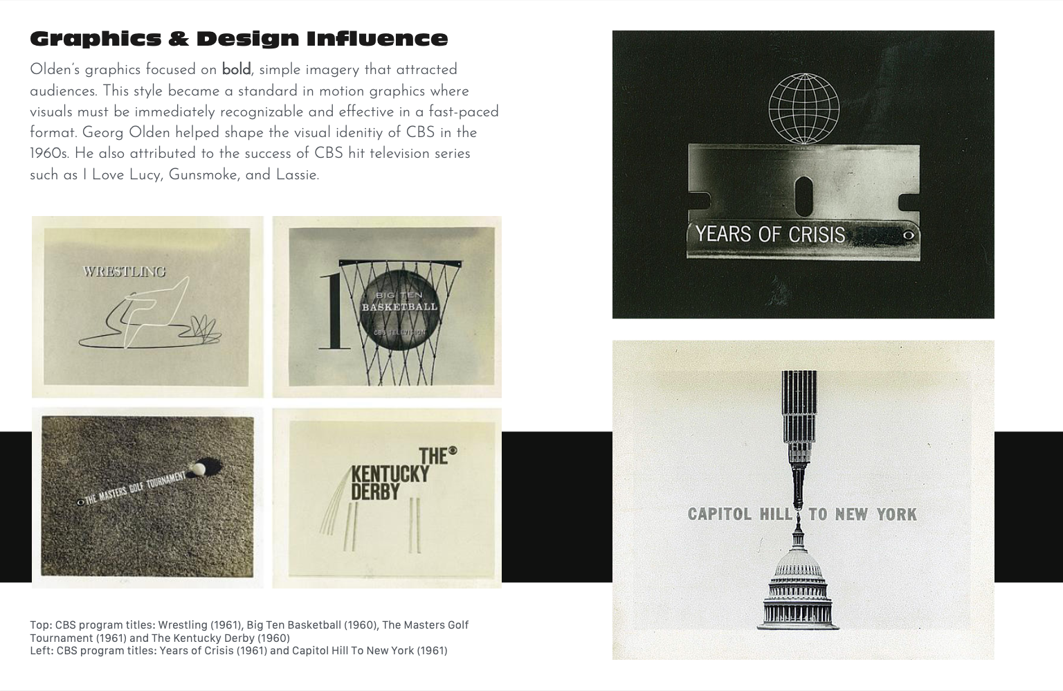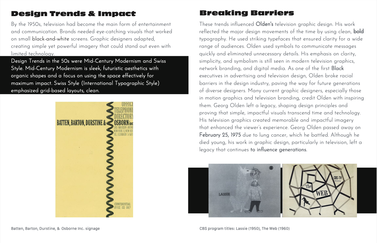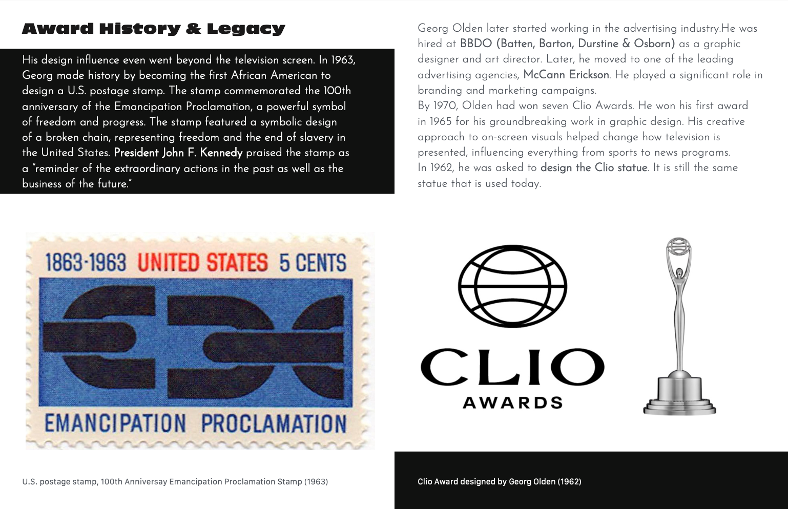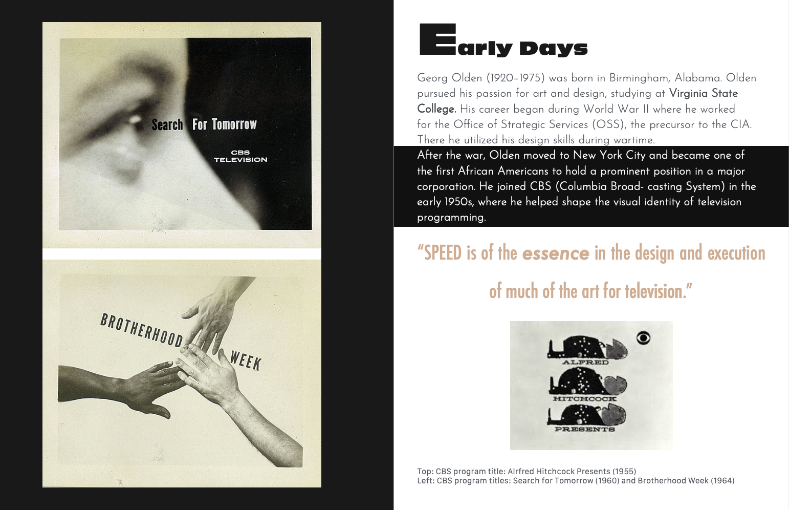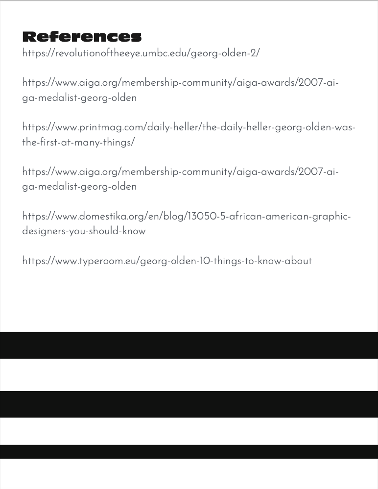 This editorial zine was designed as both a tribute to and an extension of Georg Olden's own design philosophy. Rather than simply documenting his legacy, the layout itself became a demonstration of the principles he pioneered, using bold typography, clean grid-based structure, strong contrast, and imagery that communicates with immediacy and clarity. Designed entirely in Adobe InDesign, the editorial design was informed by Olden's visual language: striking typefaces that command attention, a balance of white space and dense content, and the pairing of archival imagery with type that gives each spread its own visual weight.