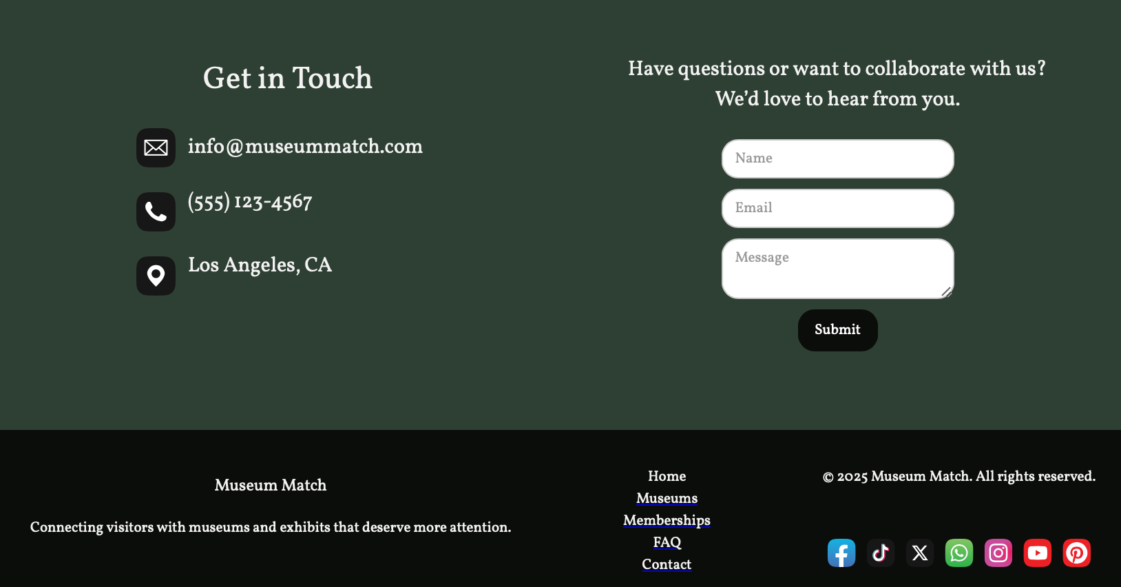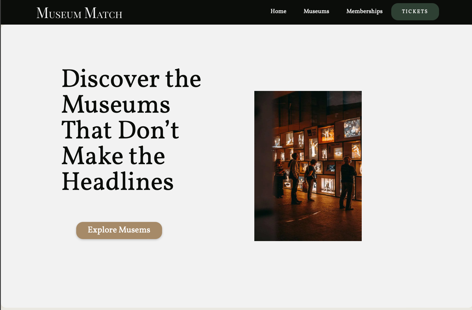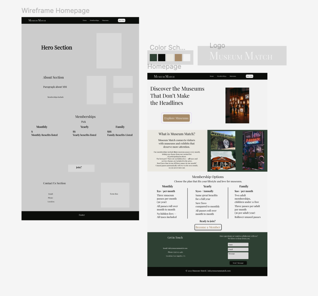 Museum Match is a membership platform designed for the museum community, connecting curious visitors with local and under-the-radar museums and exhibits that deserve more attention. The design process began with user research and demographic testing to identify gaps in the industry. After, in Figma, wireframes were built first to establish the site's structure and user flow before any visual decisions were made, ensuring the layout served the experience rather than the other way around. Figma also became the space to develop a cohesive color scheme and freely explore layout possibilities, testing hierarchy, spacing, and visual rhythm without the constraints of a live build environment. Once the design was established, the site was built in Webflow, translating the Figma compositions into a fully functional, polished website. The result is a clean, intentional interface that reflects the thoughtfulness of the community it serves, making discovery feel as considered and rewarding as the museums themselves.
