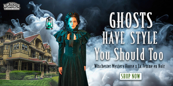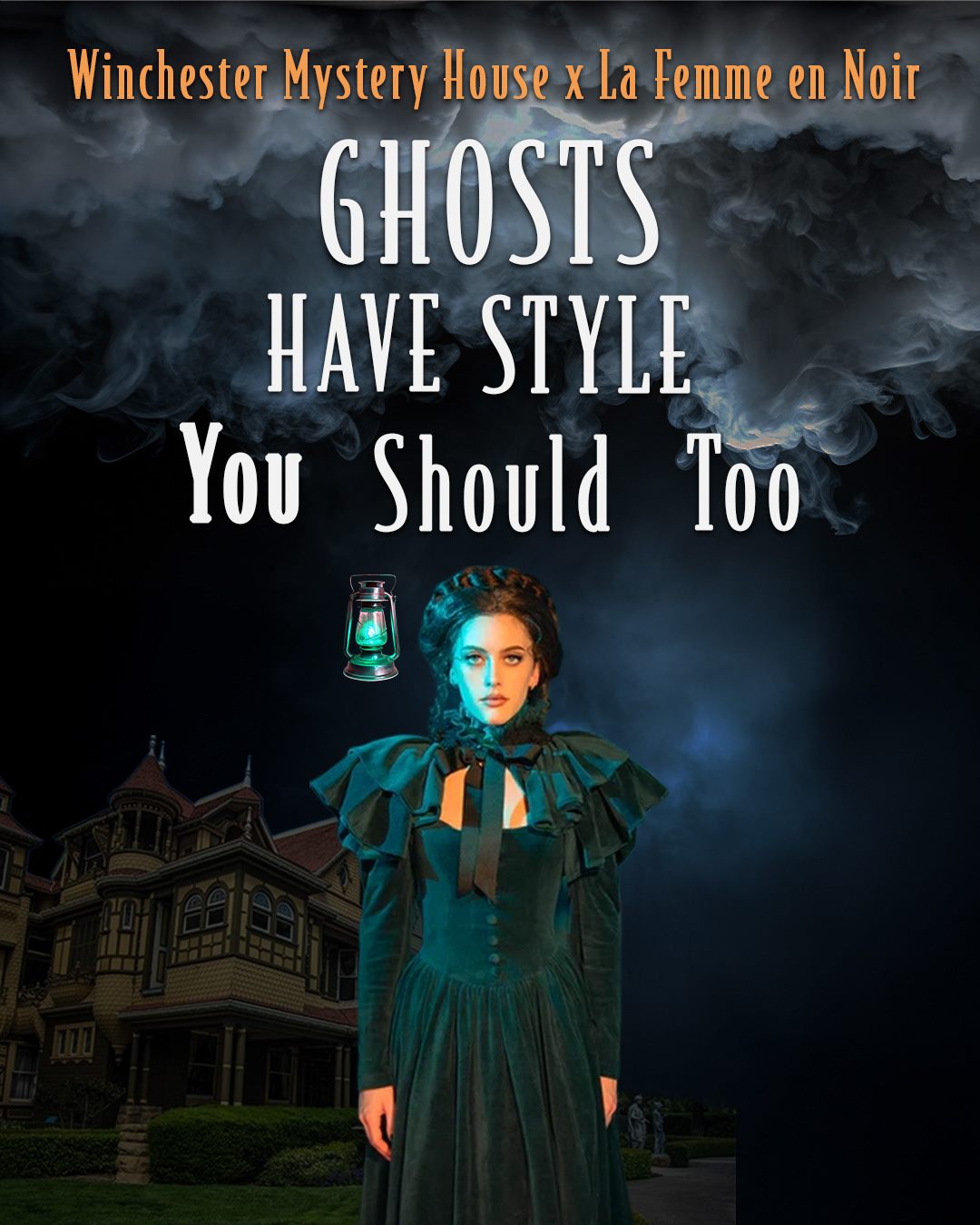 The centerpiece of the campaign was a reel set inside the Winchester Mystery House itself, where ghosts drift through the mansion's iconic spaces dressed in La Femme en Noir pieces, merging the language of fashion editorial with gothic atmosphere.