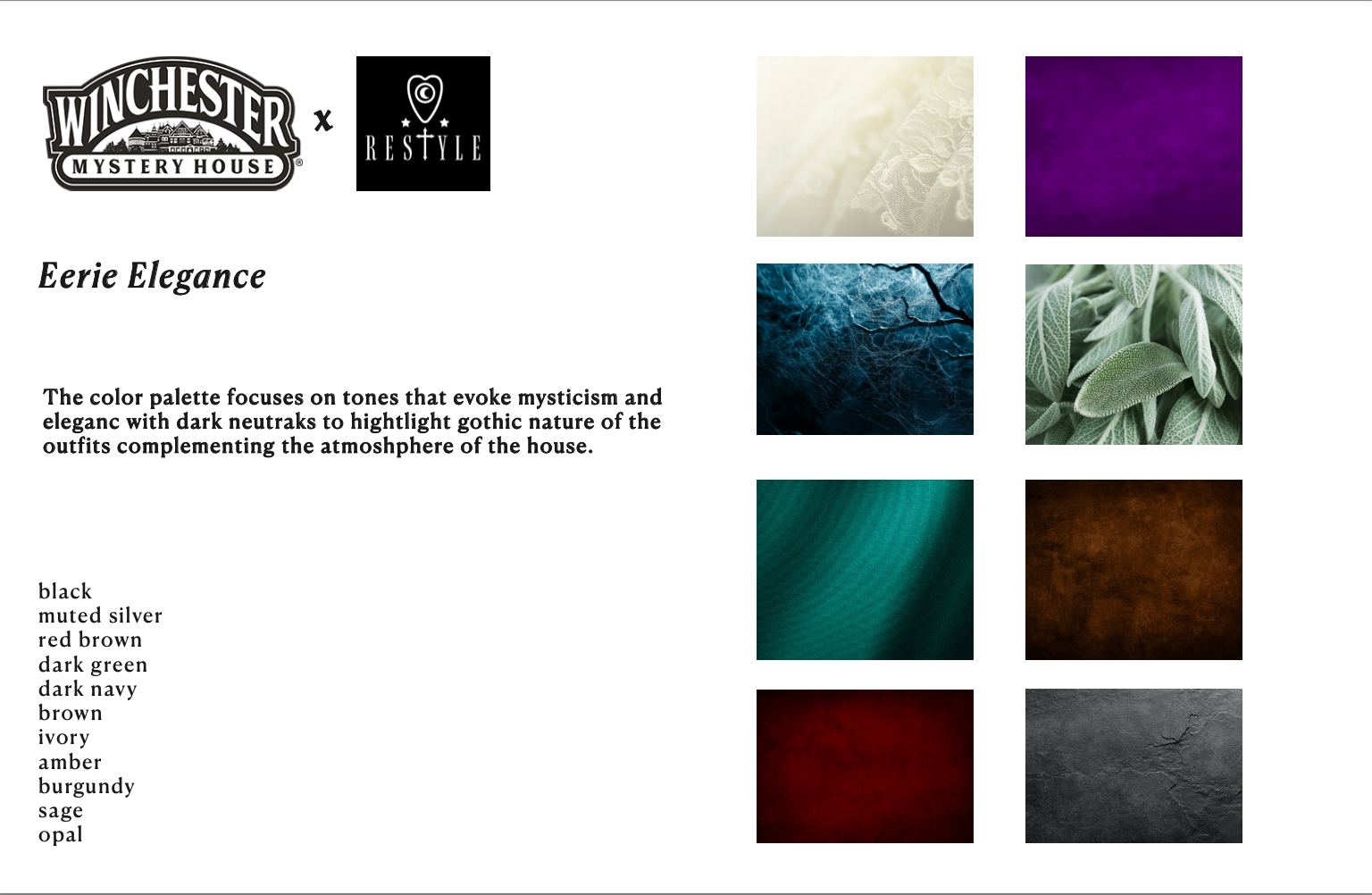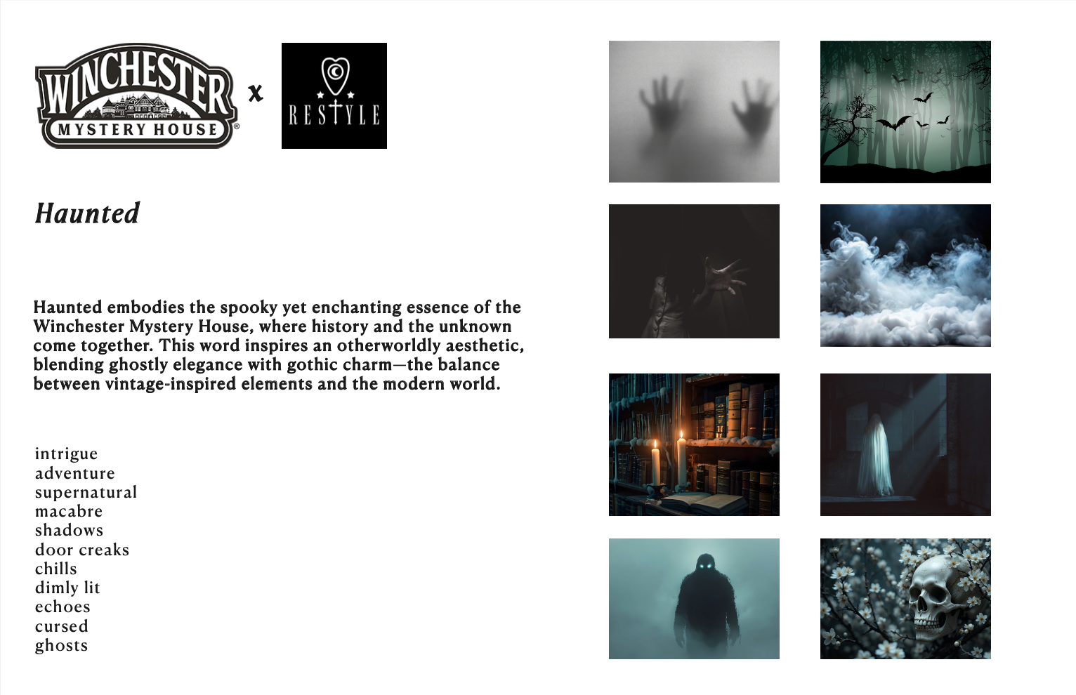 This self-directed campaign began with a single concept: What do you wear to the Winchester Mystery House? Rooted at the intersection of fashion, lifestyle, and the supernatural, the campaign envisioned a collaboration between the Winchester Mystery House and La Femme en Noir, a darkly elegant brand whose aesthetic felt at home amid the mansion's storied hallways and restless spirits.